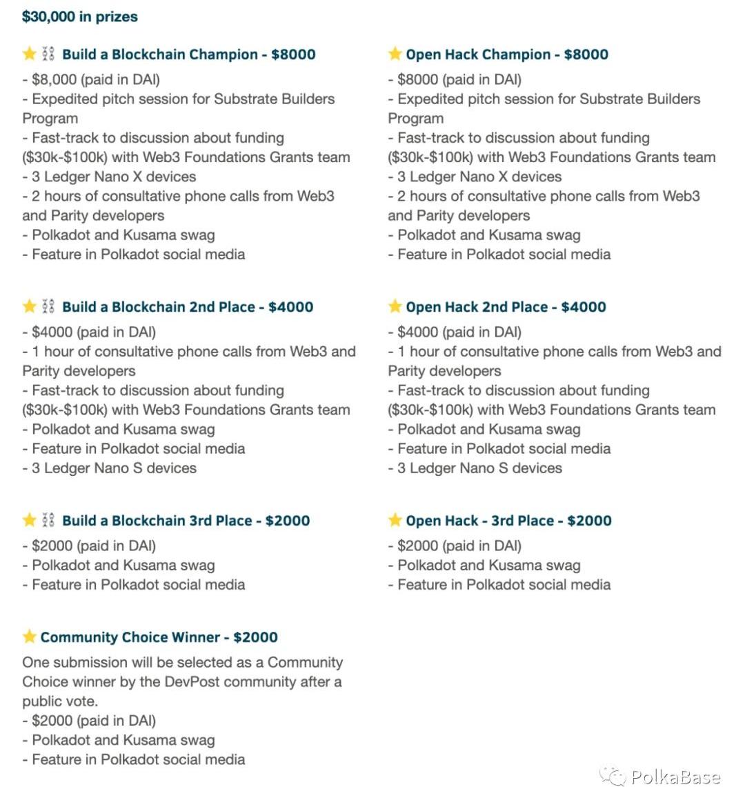 Hackathon从今天6月29日开始,一直持续到8月14日。不仅有总价值30,000美元的奖品可供赢取,还有其他的奖励:SubstrateBuildersProgram的快速推介会、与Web3Foundation团队讨论Grant、LedgerNano设备、Web3和Parity开发人员的直接支持、Polkadot社交媒体上的推广以及Polkadot和Kusama周边。