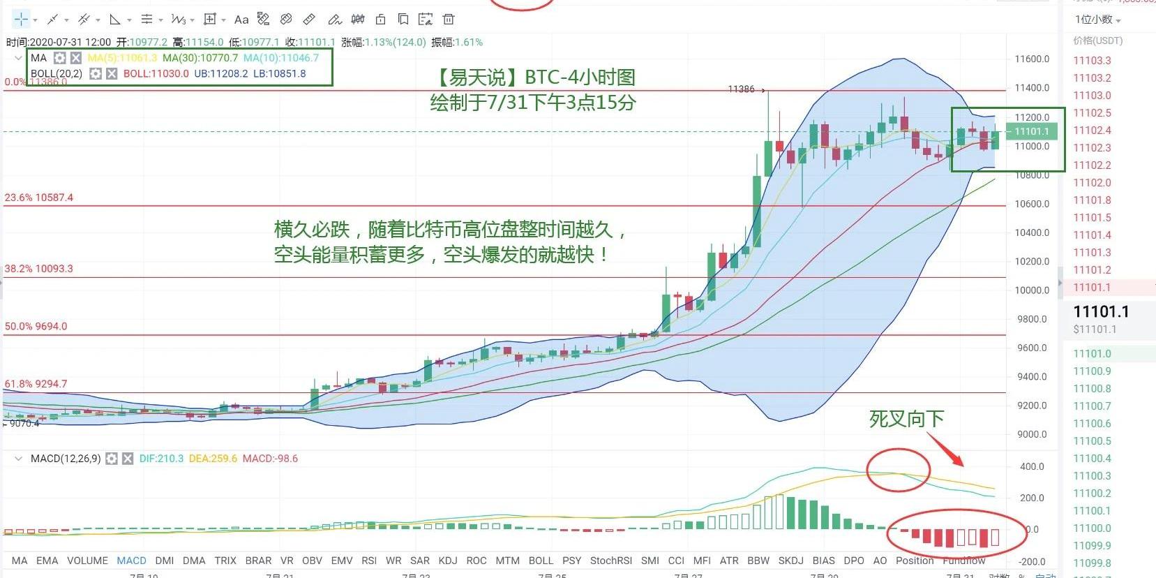 在从4小时图来看一线,目前BOLL通道已经开始收口,比特币行情运行在BOLL中轨处,各均线粘合运行在中轨附近,对目前比特币行情形成支撑和压力,但是比特币今日的波动都随意破位这些支撑和压力,目前行情处于BOLL中上区域;下方能量指标MACD快慢线形成高位死叉迹象,多头能量已经转为空头红色能量柱,但是目前随着行情的高位盘整,空头能量逐渐缩减中;综合分析,易天(aphz8705)认为横久必跌,随着比特币行情的盘整时间越长,空头能量积蓄越大,空头一旦爆发,下跌的必然越快!