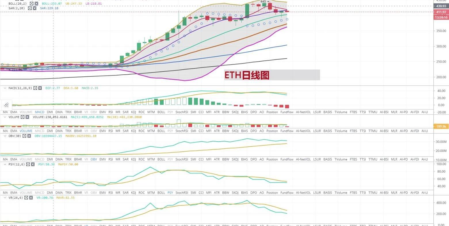 以太坊之前持币者也写到过,以太坊领涨比特币的时候,以太坊和比特币关联性虽然减弱,但并未断绝。目前比特币和以太坊持续上涨阶段已经过去10几天了,关联性是正在加强的。可以在比特币和以太坊的日线图中可以看到,虽然主力资金在MA5日均线和MA10日均线快要形成死叉阶段强力拉盘,但该来的还是会来的。