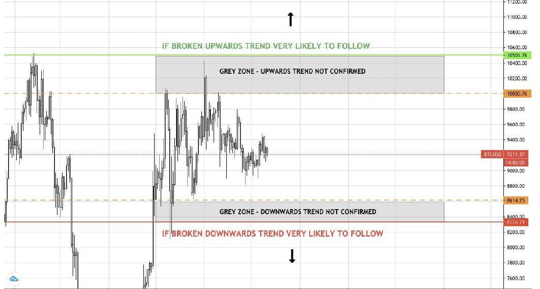 币价仅在9450美元-9000美元区间内波动,这段时间的极低波动率意味着BTC很可能正在为大的走势做准备,尽管这个走势的方向仍然有些不明确。上一份报告中的突破位仍然和以前一样--目前还不清楚BTC将向哪个方向波动。