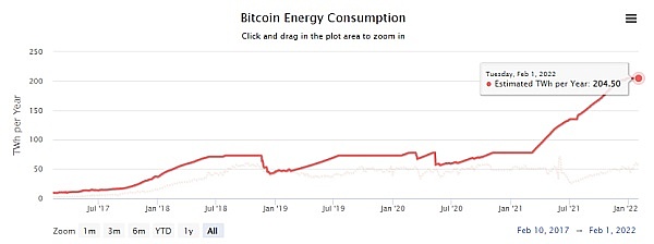 能耗问题:该问题同样出现在使用PoW作为共识的数字资产项目中,由于这种类型的数字资产的产生需要大量的密码学计算,因此会产生极大的电力功耗。例如以2022年2月1日的用电量为基础进行简单估算,则该年的年用电量将会高达204.5TWH,相当于泰国一年的总用电量。