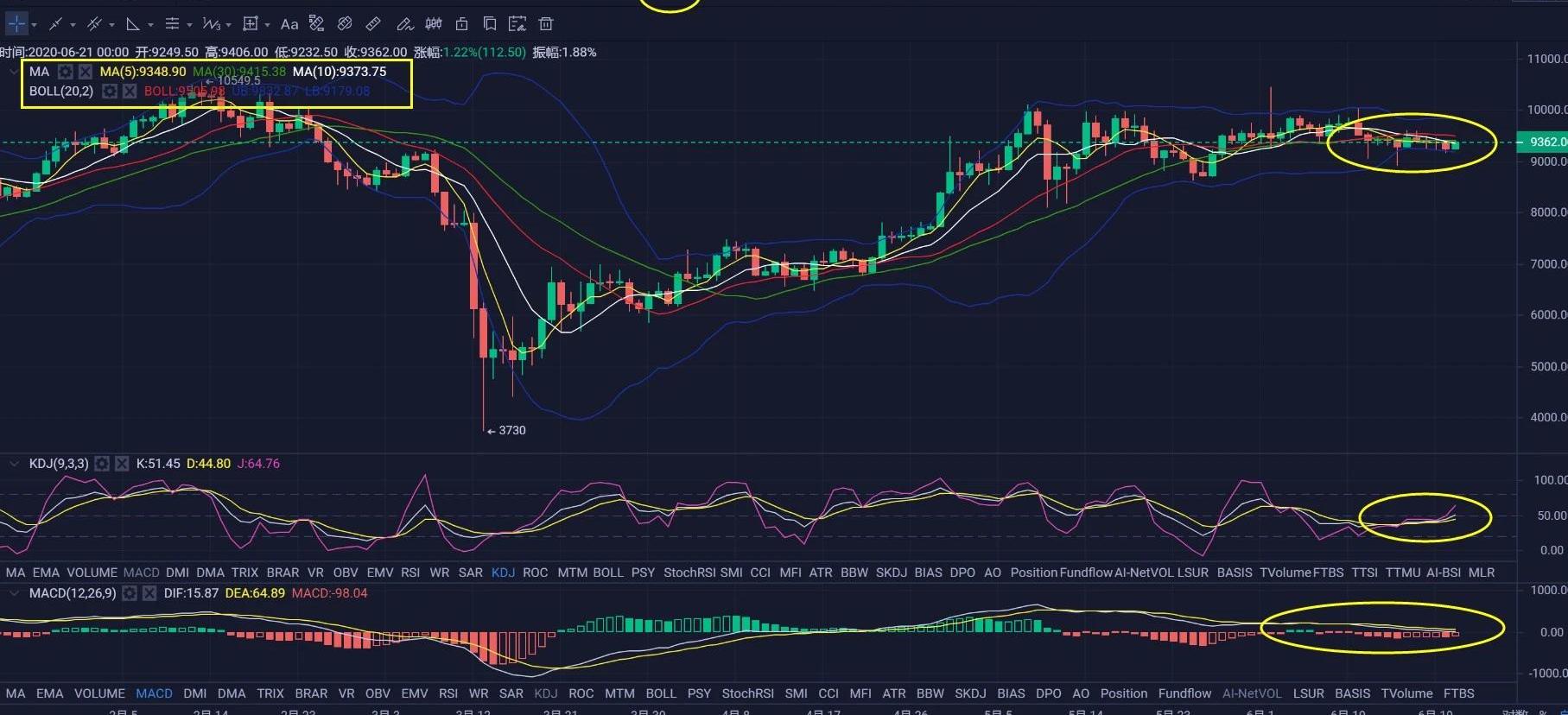 再从4小时图来看一下,随着今天早间的一波反弹,BOLL通道由下行逐渐变为现在的平行运行,行情已经成功站上了BOLL中轨,位于中上轨区域运行,但是上方依然承压在绿色MA30(9385)均线处;下方KDJ指标已经金叉向上运行,能量指标MACD快慢线粘合运行且有抬头向上的迹象,多头能量已经开始释放了;综合来看,易天(aphz8705)认为比特币短周期内还会有一波反弹,上方压力位重点关注MA30(9385)均线以及BOLL上轨(9465)处!