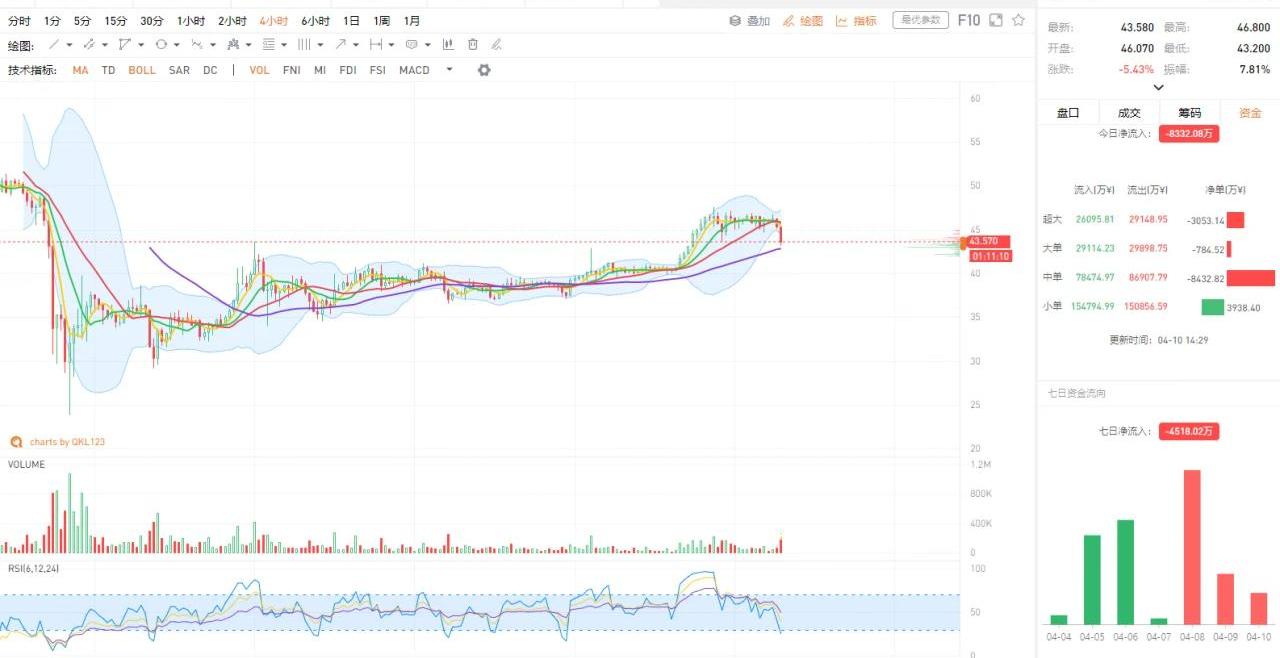 LTC今日资金净流出有所减少,资金流一致看空,下行量能有所增加。目前来到43美元支撑附近,短时试探支撑。