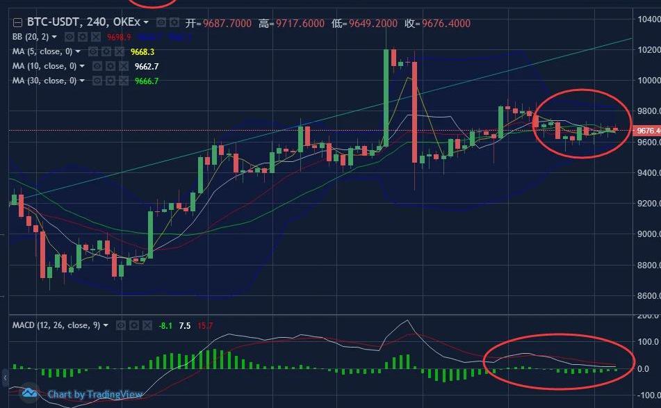 BTC行情最近一直都是区间震荡,整体维持在9400USDT到9800USDT;但目前行情越来越弱势,区间越走越小,维持在9550USDT到9750USDT;在没有特大消息面的干扰下,BTC品种的日间操作可维持高空低多;昨日开盘之后小幅上冲之后开始一路下跌,于早间8时抵达日间最低点9536USDT一线;然后迅速反弹于晚间20时长冲到日间最高点9735一线;然后尾盘BTC行情一直维持在9670USDT一线附近震荡!
