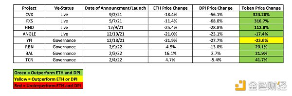 在下表中,我们审视了每个代币自实施ve-token的发布日期或声明他们打算切换到该模型的公告之日起的价格表现。我们还测量了同一时期的ETH 和DPI两个基准的价格表现。