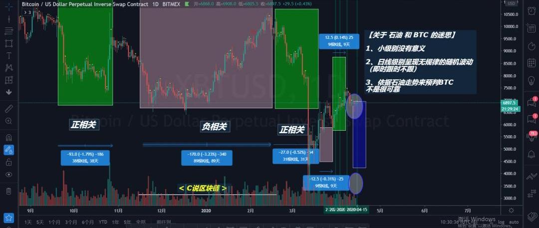 直接看图,日线级别,可以显著的看到“石油”与“BTC”的关联性正在逐渐降低,在历史行情的验证中至少会跟随1个月的正/负相关情绪不再存在,目前呈现一个“时跟时不跟”的局面,而这种随机性较大的大环境下,日内小级别的波动将趋近于更加随机无序,篇幅原因不便展开,3个结论给到各位: