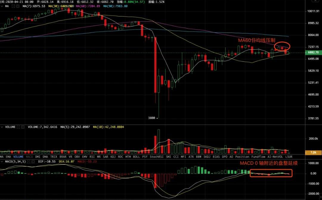 昨天早间,BTC反弹无力,未能有效突破7200美金,小时级别的MA60均线便又之前的支撑变成了压力,空头砸盘下,下跌空间打开,7000美金根本守不住,凌晨最低下探至6750美金,短时间内在6800-6900美金区间内盘整。
