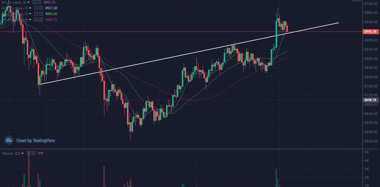 15分钟级别目前行情处于刚刚突破多空分界线回踩阶段,回踩点位8990一线,有效跌破看空,不能有效跌破则看多。
