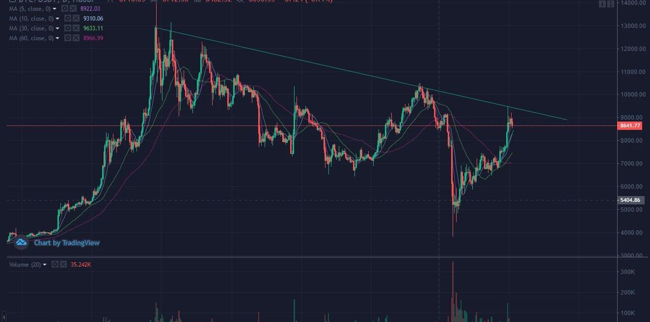 比特币日线级别当前行情已经非常贴近大级别趋势线,从图中我们可以看到,行情在4月30日最高达到9456后迅速下跌并未能突破,在后续持续四天行情并没有出现下跌,那么这就表示,多头情绪并没有消退,后续有再次冲击高点的可能。再次大家注意9400这个位置,若能有效突破站稳,则多单进场,若只是试探则反手空单进场,所以再此,投资者要观察好这个位置再进场操作。