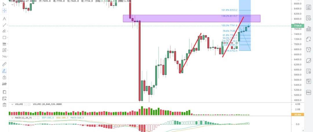 日小级别回踩支撑介入做多,如果放量快速突破7752可轻仓追多,上方目标先看到8000整数关口,关键支撑:7630、7500、7200、7000,关键压力:7800、8000、8200