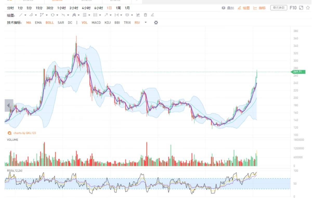 相对BTC,ETH上涨空间打开后加速上涨,目前来到270美元附近,短时放量明显。观察BTC是否上攻10800美元,若联动回调,回调幅度也会较大,不宜追高。