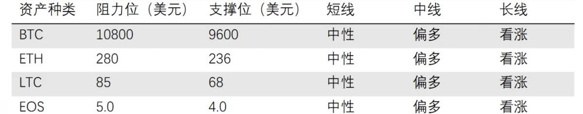 BTC长期趋势转好,未来一至两年有望迎来疯牛行情。智能合约平台龙头ETH、山寨币龙头LTC、DPoS龙头EOS可逢低配置。
