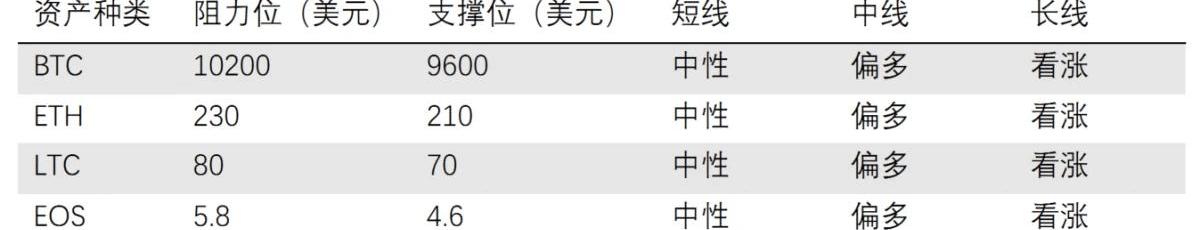 BTC长期趋势转好,未来一至两年有望迎来疯牛行情。智能合约平台龙头ETH、山寨币龙头LTC、DPoS龙头EOS可逢低配置。