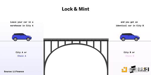 1、把你的车放在位于 A 市的一个仓库里,作为交换,你会在 B 市得到一辆一模一样的车。当你返回 A 市时,你只需要把你当初抵达 B 市时获得的这辆车归还,然后把你原来在 A 市的那辆车拿回去。这与区块链「桥」使用的「锁定 & 铸造」机制相类似。如下图所示: