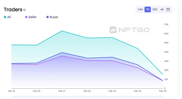 根据NFTGo的NFT交易者人数图表的趋势,可以观察到近期交易者人数明显减少,同时买家和卖家人数高度重合(NFT买家人数的减少表明需求降低),且卖家和买家的人数均低于1万。而在牛市中,卖家人数通常比买家少3,000人左右——这也是市场流动性高和市场需求大的标志。从下面的图表中,可以观察到上周市场明显下挫。
