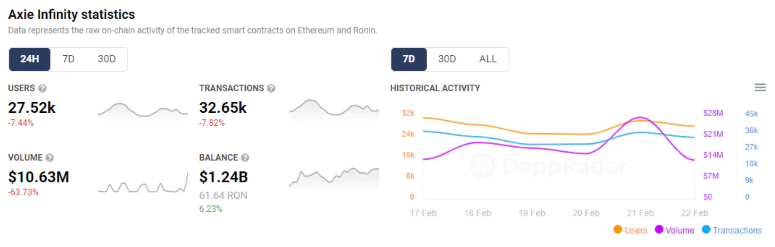 从资本角度来说,目前是普遍社区认同的数字货币熊市,Gamefi 也过了炒作期了,所以当前的区块链游戏 Axie 的数据值得观察。