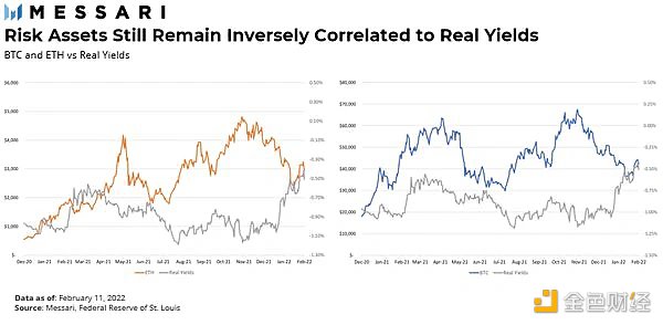 在过去10年唯一的加息周期中,BTC和ETH都持续表现良好,表现优于其他风险资产。在利率上升的两个重要时期,这两种资产的结果喜忧参半。在2012年至2014年期间,实际收益率(与通货膨胀率挂钩的国债收益率)保持在区间内。国债收益率作为一个无风险的回报,当考虑到通胀因素时,其结果就是任何投资的真实最低回报率。当利率较低或为负数时,门槛并不高,导致人们将现金存在银行或短期证券中的动机减弱。风险资产对实际利率非常敏感。在相当长的一段时间里,实际收益率一直为负。随着2021-2022年期间通胀上升,实际收益率飙升,BTC和ETH也随之被抛售。