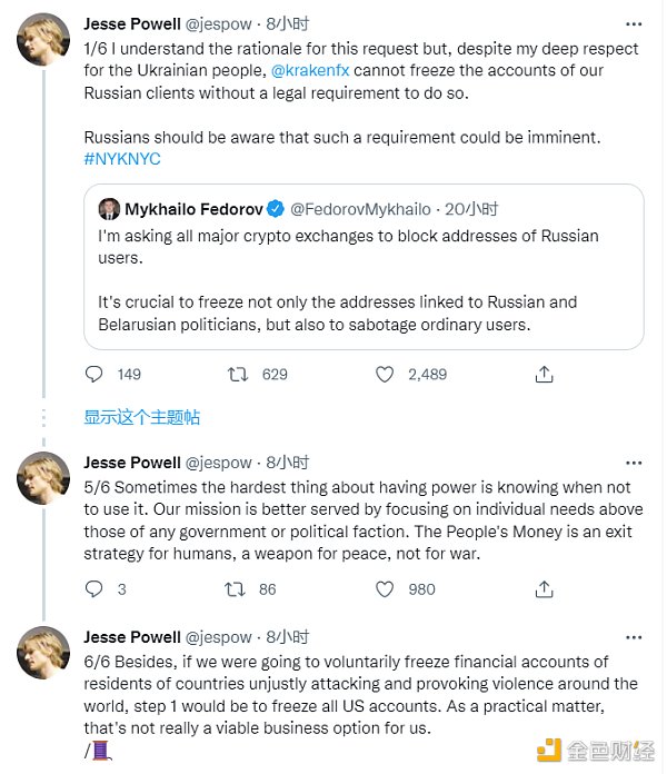 值得一提的是,Kraken 首席执行官杰西·鲍威尔回应称,我理解这一要求的理由,但尽管我对乌克兰人民深表敬意,但如果没有法律要求,我们不能冻结我们俄罗斯客户的账户。拥有权力最难的事情就是知道何时不使用它。将个人需求置于任何政府或派别的需求之上,可以更好地履行我们的使命。人民的钱是人类的退出战略,是和平的武器,而不是战争的武器。如果我们要自愿冻结世界各地不公正地攻击和挑起暴力的国家的居民的金融账户,第一步将是冻结所有美国账户。实际上,这对我们来说并不是一个真正可行的商业选择。