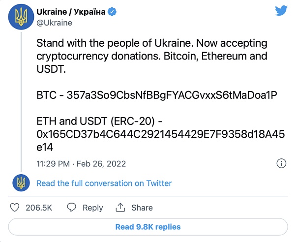 2 月 26 日,乌克兰官方 Twitter 账号发出推文,呼吁全球网民捐款用来「支持乌克兰人民」。推文中直接给出了比特币和以太坊两个钱包账户,用来接收比特币、USDT 以及包括以太坊在内的以太坊区块链代币捐赠。