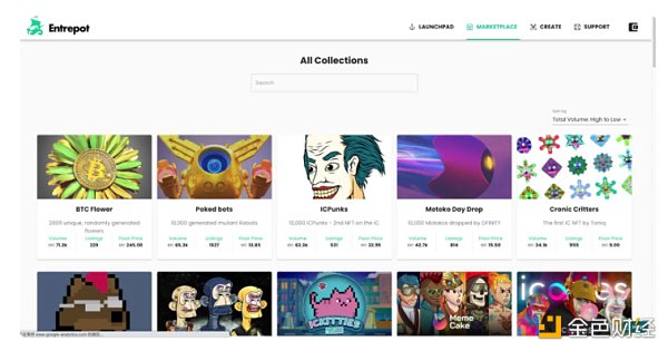 Entropot 是 Dfinity 生态的 NFT 市场,包含 NFT Launchpad 和 NFT 交易市场,二级市场的交易费用为 1%,创作者可收取高达 10%的版税,目前支持的钱包包括 Stoic Wallet 和 Plug Wallet。