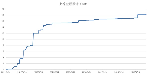 “上香”行为在比特币价值初显的2011年开始显现,但在2013年比特币价格显著上升时累计金额上涨有了明显放缓。在图中可以看到,累计金额有过几次台阶式上升。单笔金额最高的一次“上香”发生在2013年1月,金额为4BTC。1BTC以上的上香共发生过9次,其中八次发生在2014年之前,剩下的一次发生在2019年7月2日,价值约11,000美元。
