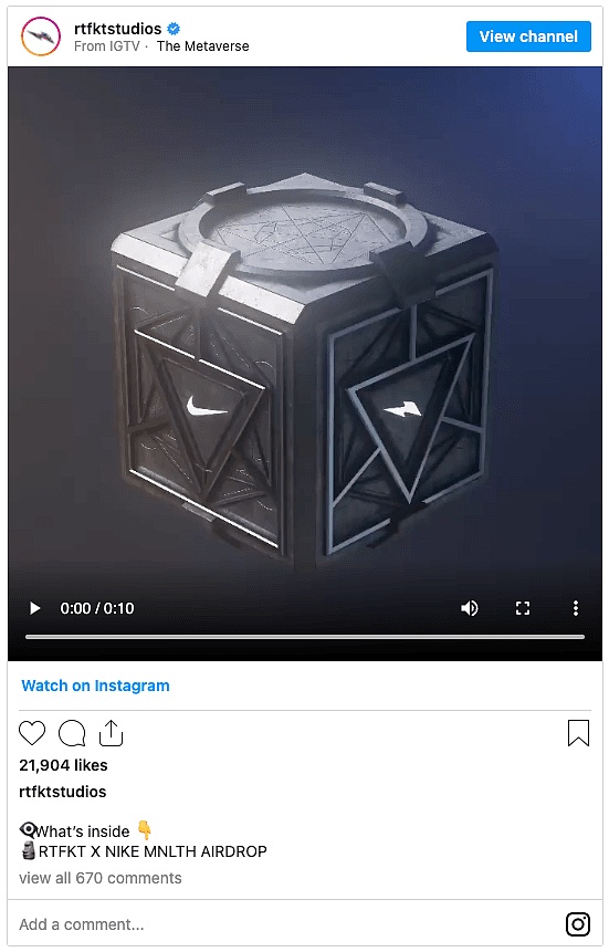 当然,还有一家知名运动品牌商也不甘落后。耐克公司于去年 12 月收购了 NFT 工作室 RTFKT,并于今年 2 月发布了一个名为“ MNLTH ”的神秘箱子。这个神秘的箱子里面究竟装了什么东西尚不清楚,目前已经被空投给了《Clone X》 NFT 持有者。《Clone X》是 RTFKT 和日本当代艺术家 Taskashi Murakami 合作推出的 NFT 系列。值得一提的是,“MNLTH ”目前在 OpenSea 平台上的售价已达 12,325 美元(4.5 ETH)。