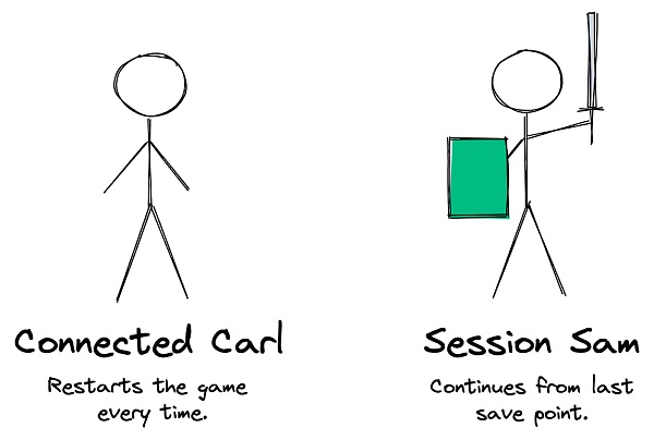 Sam 就不会有这样的问题了。Dapp 对其进行了认证并且建立了 session 之后,相关信息就会被保存下来。即便 Sam 断开连接并且重新进行认证,session 也会从他离开时的状态继续,应用程序仍然记得与他相关的一切。他的信息甚至可以保存在他控制的一个远程数据库中。