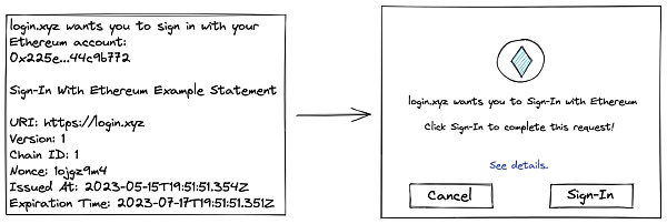 在这一点上,钱包可以呈现一个友好的程式化的界面,让用户体验更佳,并且不对用户将要采取的行动产生任何怀疑。而不是给用户一个任意的文本块来签名。用户现在只需点击一个确认对话框来 “登录”,因为钱包能够 “理解” 签名请求。为了实现完全透明,EIP-4361 规范中声明所有信息和字段仍然必须在其他子界面 (如详细视图) 中可用。