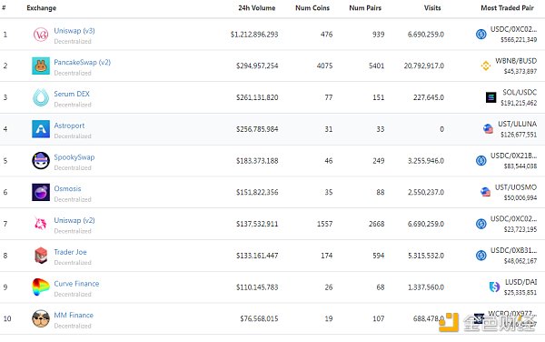 过去24小时去中心化交易所的交易量 数据来源:coingecko