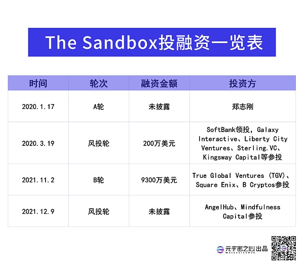除此之外,据官方披露的数据显示,The Sandbox在4次的融资中共筹集了超过9,500万美元的资金,以下是The Sandbox融资的详细信息。