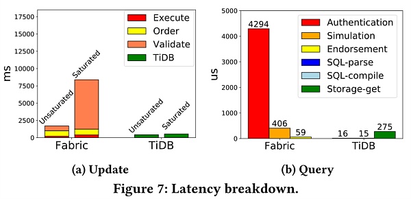 图7根据Fabric和TiDB的性能表现,比较了基于事务和基于操作的复制模型的影响。除了与TiDB相比具有更高的延迟之外,当系统饱和时,Fabric的延迟也会显著增加。而当请求速率超过系统容量时,验证阶段就会成为瓶颈。论文认为延迟增加归因于Fabric中的串行验证,区块和区块内的事务在提交以前是顺序验证的。