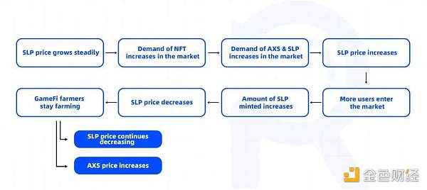 在AXS和SLP的产出未能满足消耗前,两种代币的价格都会一直上涨。实际上,玩家烧掉 AXS 和 SLP 来生成 Axie NFT,然后将其用于生成 SLP。然而,SLP 并没有太多降低通胀的方法,导致 SLP 承担了所有三种资产的全部抛售压力。