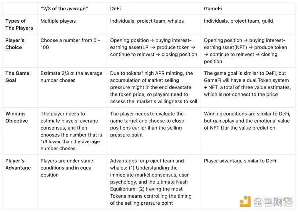 作为金融领域的经典游戏,“猜测平均数的 2/3”的博弈范式体现在区块链玩家对项目信息的认知、代币价格预期以及未来商业运营的博弈中。在本文的后续章节中,我们将详细解释普通用户、项目方、鲸鱼、游戏公会等各类玩家在 DeFi 和 GameFi 领域是如何玩共识游戏的。