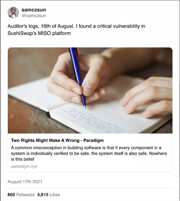 举2021/8 Paradigm 研究员为Sushiswap 拯救了3.5亿美元这个例子。