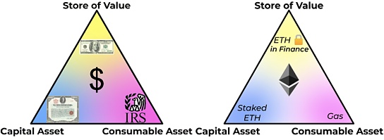 2019年,Bankless联合创始人David Hoffman是最早尝试参考传统货币体系来定义ETH的研究者之一。他在一篇题为“以太坊:三点资产”的文章中指出,ETH是第一个横跨三大资产类别的资产,即价值存储、资本资产和消耗性资产。