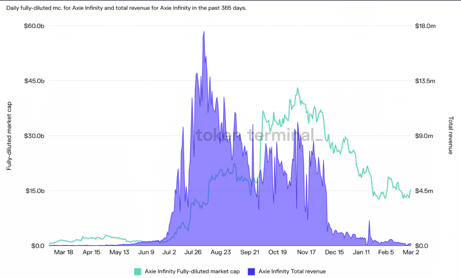 与此同时,如何开发一款能够长期吸引玩家兴趣的区块链游戏也值得关注。Axie Infinity的日营收从2021年3月初的1万美元一度增至巅峰时期的1750万美元,但随后收入一直在下降,这突显出人们对区块链生态系统的兴趣转变非常迅速。