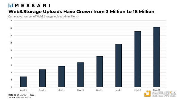 为了简化在Filecoin上构建Web3应用程序,该团队推出了Web3.Storage。它允许开发人员直接在Filecoin上存储和检索数据,而不是处理复杂的去中心化存储网络。它在多个Filecoin矿工和IPFS上的地理分布节点上冗余存储数据,由Web3.Storage团队运行。此外,该服务还提供无限数据的无限期免费存储。FilecoinPlus机制的经济性使这成为可能。从本质上讲,去中心化存储可以成为开发人员在Filecoin之上构建应用程序的商品。总体而言,Web3.Storage自推出以来经历了稳定的增长,从2021年8月的300万次上传增长到2022年3月的1600万次。