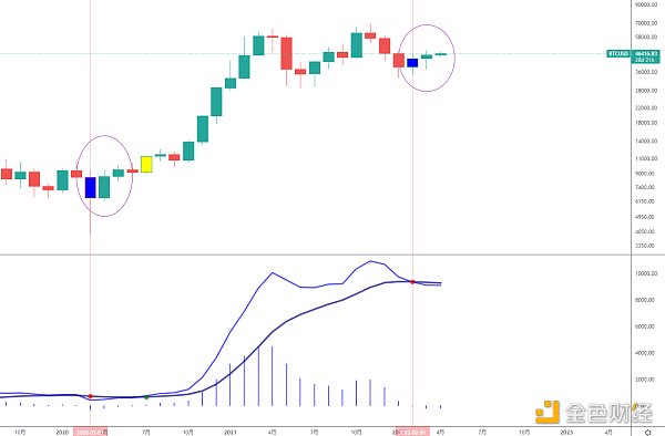 而2020年死叉反弹后BTC继续向上回升,图中可以看出本身该指数处于相对低位,而目前是高位死叉,与2014和2018比较相似,并且2020年3月经历一波大跌洗盘,2020年也是BTC产量减半年,3月大跌后4月阳线反包,和目前是有区别的,而近期月线反弹收线也未能站上这一轮顶底0.5-0.618(48000-52000)回撤线上方,所以后面就要做好反弹修复后再次回落的准备,不要盲目追高。