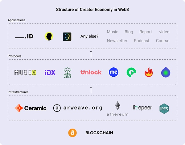 我根据基础设施->协议->应用这一结构整理了一些 Web3 创作者经济的生态项目。首先说明一下,这份蓝图中的项目只限定在基础设施->协议->应用这一结构之内,因此它是狭义的,没有涵盖此结构之外的大量项目。另外,我希望更聚焦于创作本身,所以没有将周边服务纳入其中,例如 NFT 交易市场。