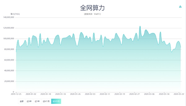 根据 Viabtc 数据,今年3月1日比特币全网算力超过了 123.9EH/S,而在3月23 日,这一数据下降到 83.8EH/S。