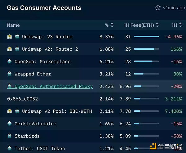 这些交易都用来干啥了?答案是智能合约,每月有 40 万个合约部署,包括 DEX、NFT、Token 等。本文撰写的时候,Gas 消耗最高的是: