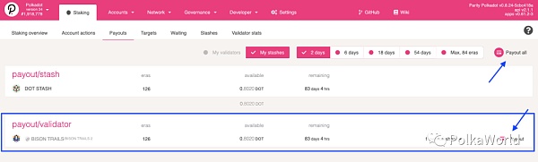 Payouts 通常在每个 ear 结束后由验证人完成。如果你的验证人尚未开始领取奖励并且你迫不及待想要领取,你可以通过点击右上角的 payout 按钮或 pending payment 旁边的按钮来开始领取。请注意,这将花费你的交易手续费。如果你不着急,只需等待验证人(或其他人)来领取。