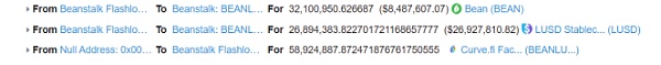 2. 黑客通过闪电贷换取了350,000,000个DAI,500,000,000个USDC,150,000,000个USDT,32,100,950个BEAN和11,643,065个LUSD作为资金储备。
