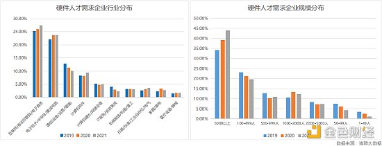 从近三年硬件人才需求企业的规模分布来看,5000人以上的大型企业和100-499人左右的中小企业对硬件人才的需求最旺盛。近年,千人规模企业对硬件人才的需求相对平稳甚至逐年提升,而百人以下企业的需求则呈现逐年减少的状态。可见,硬件人才的需求越来越往规模大的企业集中,也将带动硬件人才未来越来越往大型企业聚集。