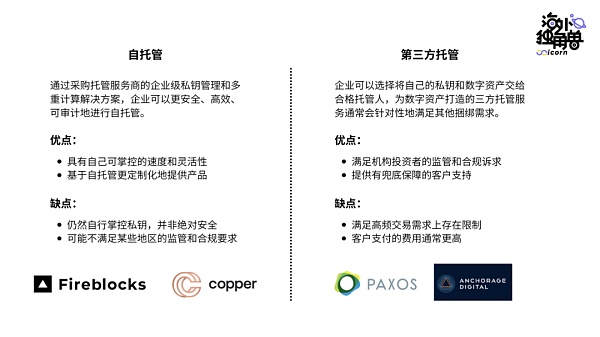 如果按照 DeFi 公司、FinTech 公司以及包含投资基金在内的传统金融机构来划分客户群,那么 DeFi 公司通常会选择自托管,FinTech 公司在全球扩展的过程中可能会同时采用两种解决方案,而传统金融机构则更多采用第三方托管以满足监管诉求。