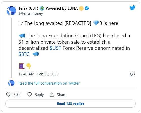 另一个最近推动 Terra 增长的因素是“Forex Reserve”储备金的创建。Terra 生态发展组织Luna Foundation Guard (LFG) 在 2022 年 2 月 23 日宣布 (见下图),这个非营利性组织已经通过出售 LUNA 代币从三箭资本 (Three Arrows Capital) 和 Jump Crypto 等主要实体筹集 10 亿美元,旨在囤积比特币 (BTC) 作为后盾,帮助维持 UST 的锚定。