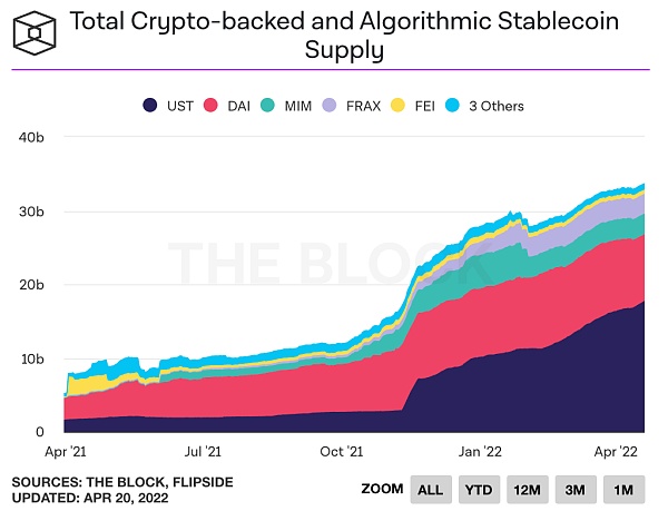 上图:过去一年中 UST 稳定币的供应量增长情况。数据来源:?The Block