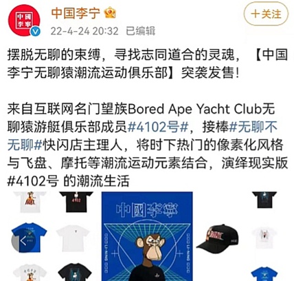 4月24日消息,中国李宁在社交媒体上发文表示,推出中国李宁无聊猿潮流运动俱乐部系列服装,该系列服装以Bored Ape Yacht Club#4102形象为主题,融入像素风、街头风等潮流元素。同时,中国李宁将于4月23日至5月4日在线下推出话题为#无聊不无聊#快闪店。