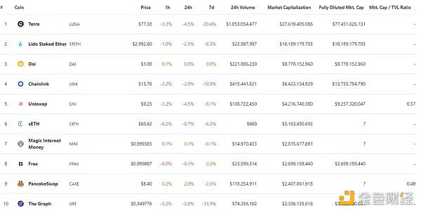 DeFi项目锁定资产前十排名及锁仓量 数据来源:defillama