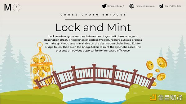 锁定源链上的资产并在目标链上铸造合成代币。这是目前最常见的桥接类型。ERC20 代币就是一个很好的例子,ERC20 可以代表以太坊上的任何资产,比特币变成 wBTC;甚至以太坊本身也可以被包装成 wETH。